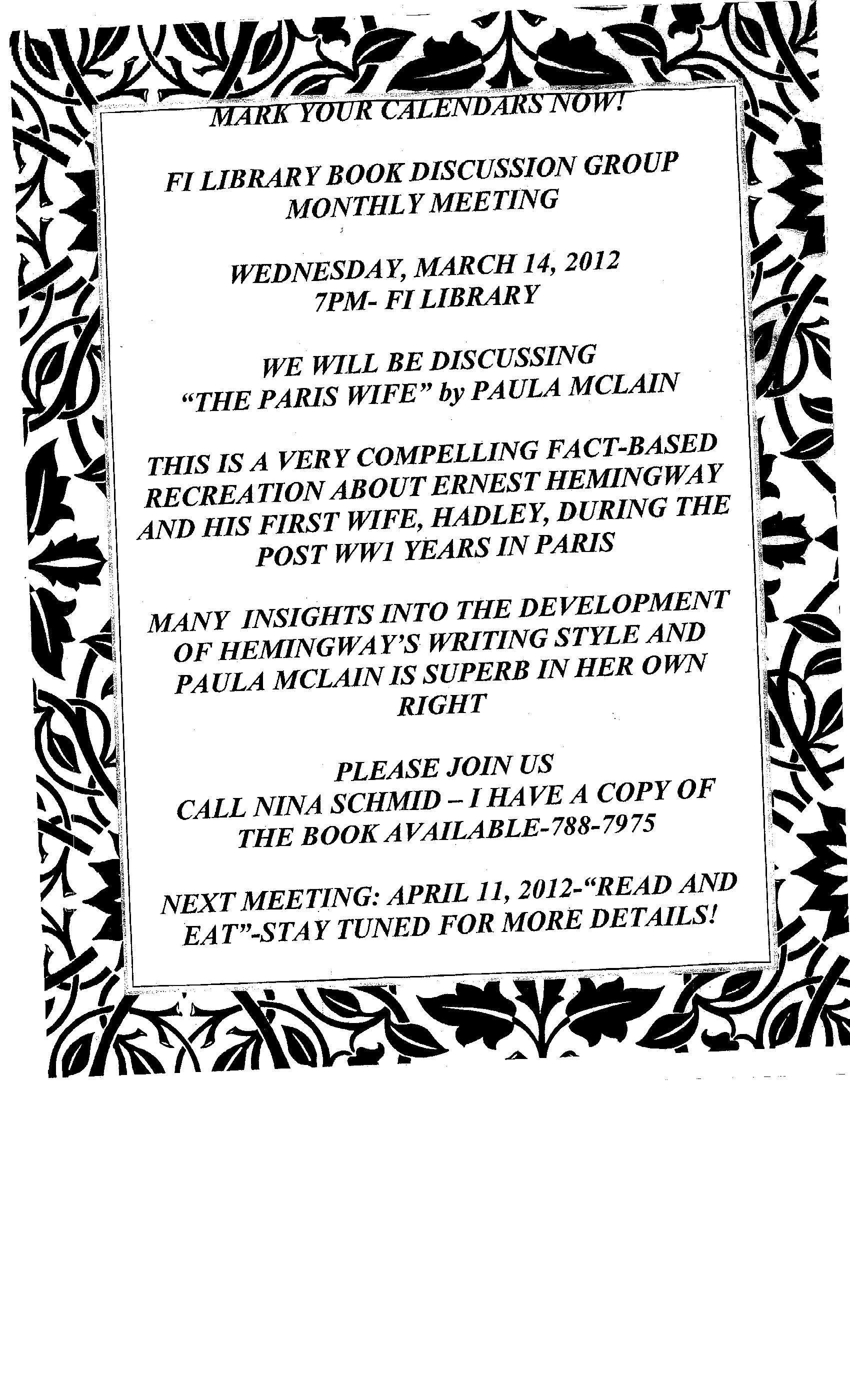 Library: Book Discussion "The Paris Wife" by Paula McLain
